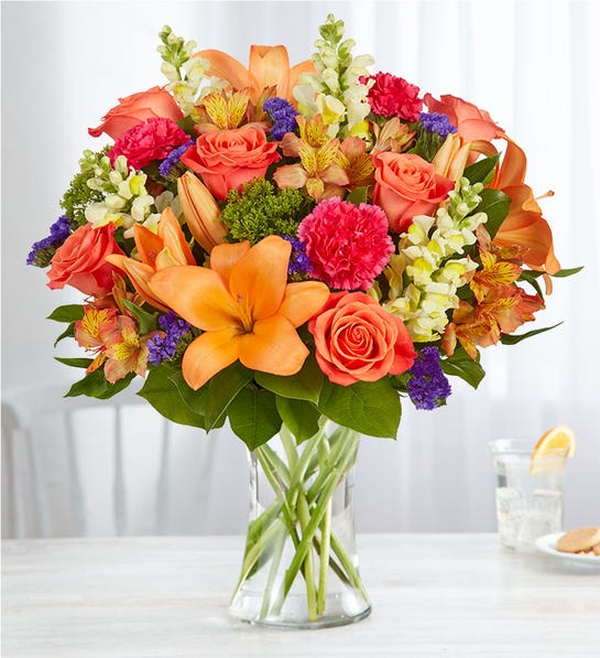 From birthday parties to anniversary dinners, floral arrangements full of fresh, beautiful flowers are the perfect complement. Whether you choose to send a bright arrangement of yellow sunflowers, vibrant roses, and colorful lilies, or a flower arrangement with delicate pastels, smiles are sure to follow!...Find your favorite flower in our grand collection of floral arrangements including roses, tulips, carnations, orchids, lilies, and more. When you get a flower arrangement delivery from 1-800-Flowers.com, your recipient is guaranteed to love it for days to come. If you're in a rush- no need to sweat! For the busy-bees and the procrastinators, we've got you covered with same-day flower delivery available all year long. So, whether you're sending a dozen roses to celebrate your love or sending a floral arrangement just because, let the flower experts at 1-800-Flowers.com help you gain the title of "best gift giver!"